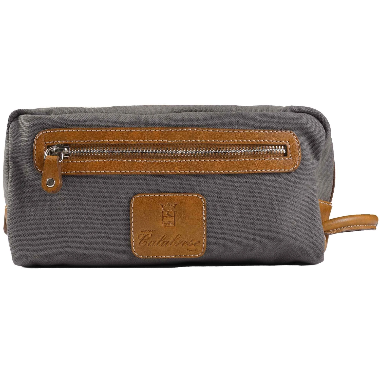 The traditional canvas wash case by Calabrese, with a cotton interior and canvas exterior, finished with leather accents. Perfect for all your toiletries on your trips away.