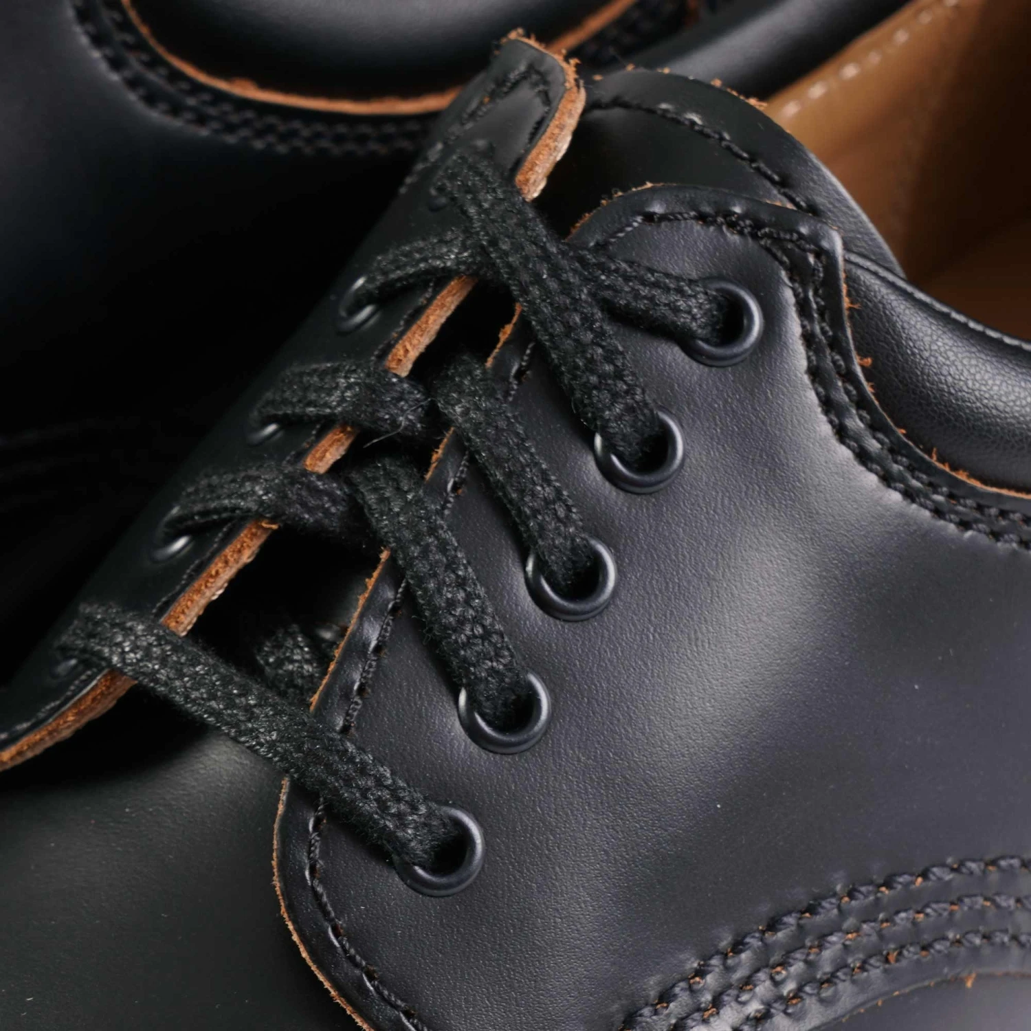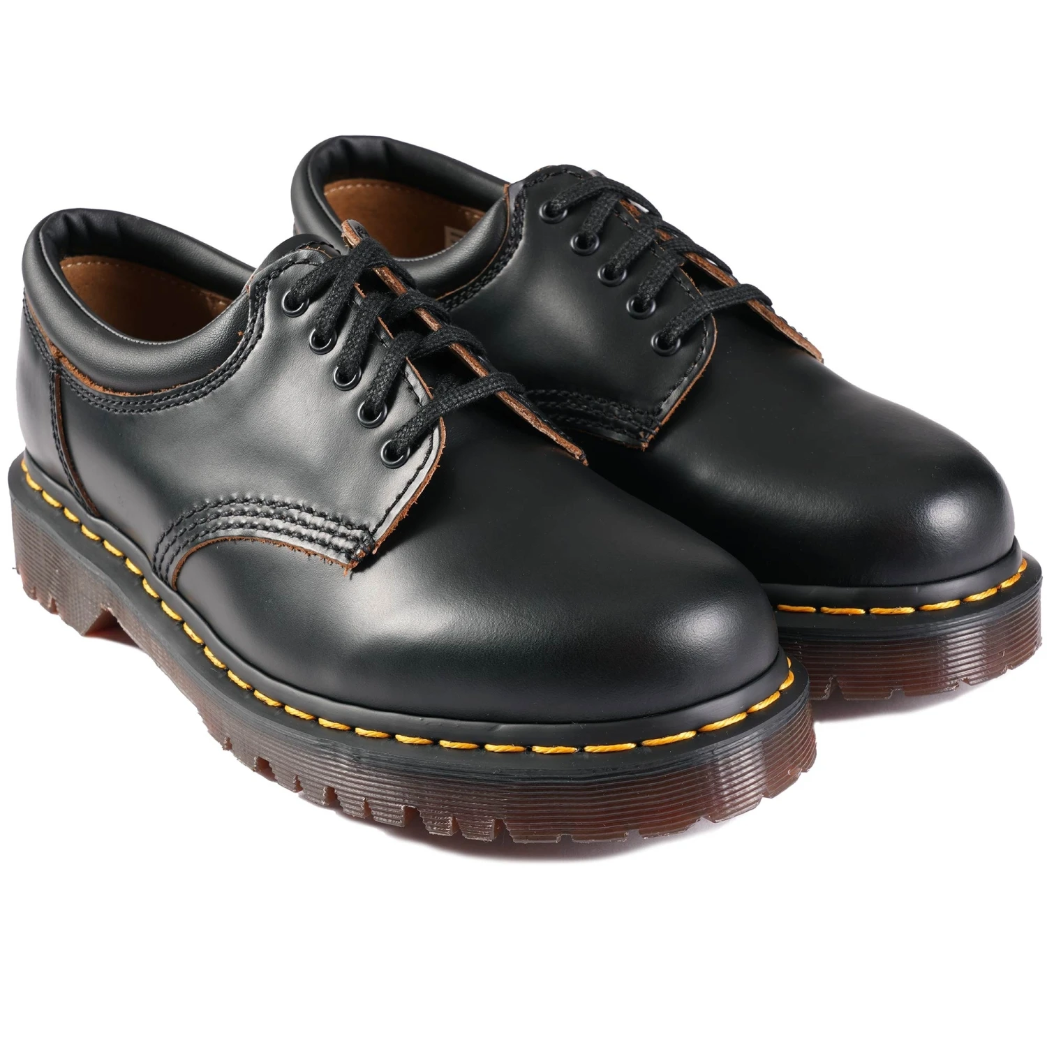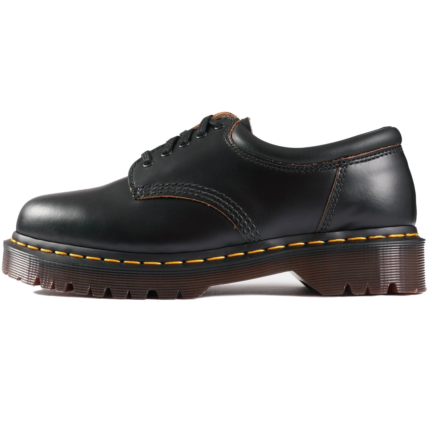 Built for comfort. Dr. Martens have reworked the 8053 5-eye shoe using character-rich Vintage Smooth leather. The shoe’s padded PU collar takes the edge off the first few wears, and their rugged, lugged BEN outsole provides some extra utilitarian edge — secured as always with their yellow welt stitching. The shoe has black eyelets and a black and yellow heel loop.