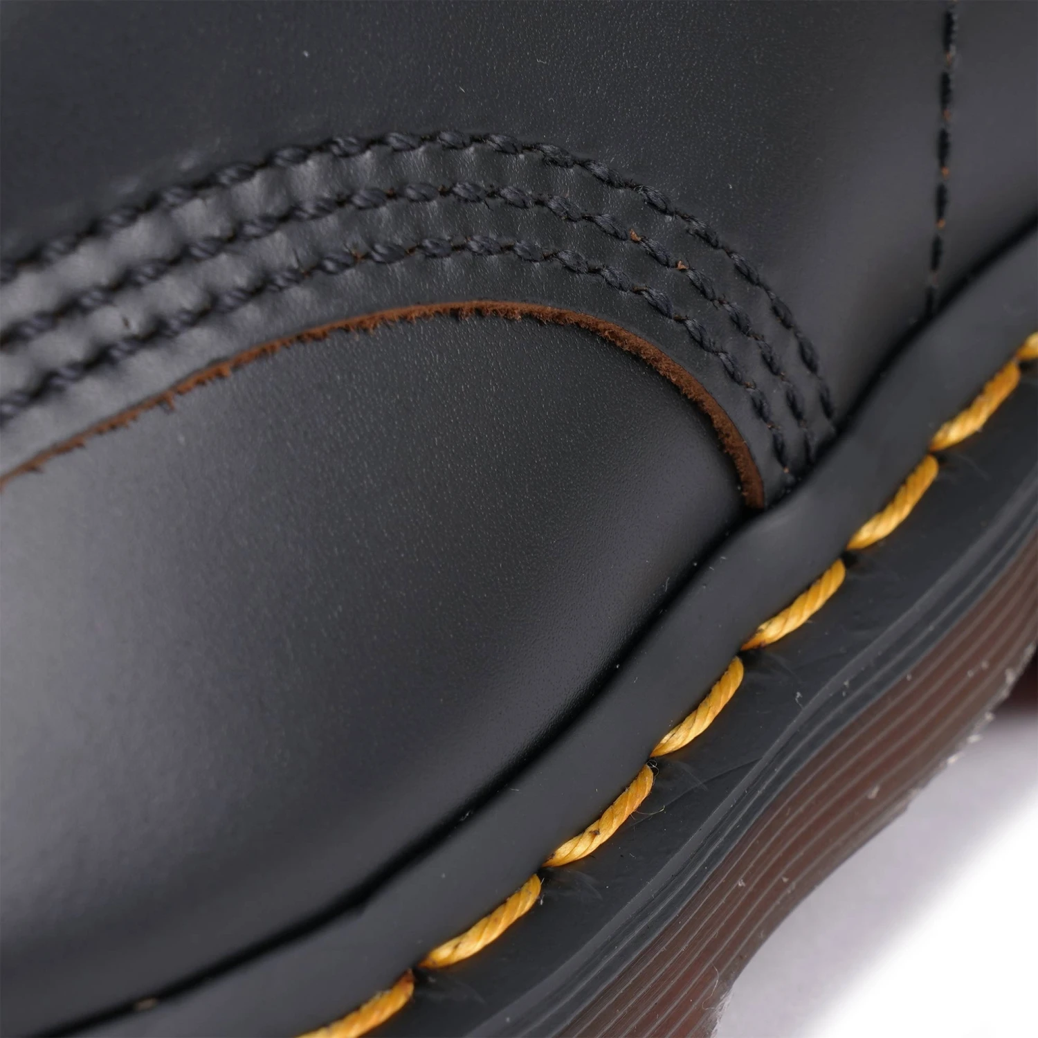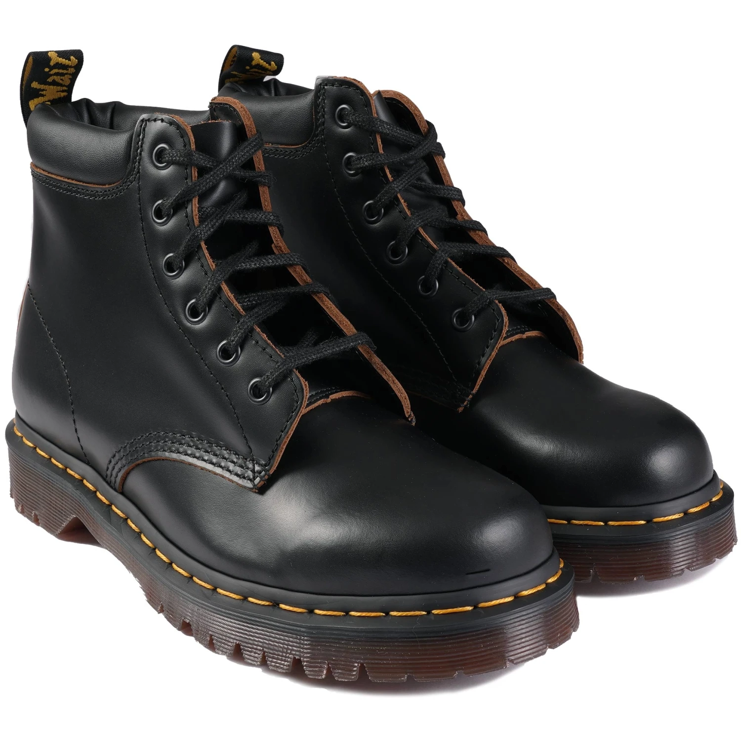 Built for comfort. Dr Martens have reworked their classic 939 6-eye ankle boot using character-rich Vintage Smooth leather. The boot’s padded PU collar takes the edge off the first few wears, and their rugged, lugged BEN outsole provides some extra utilitarian edge — secured as always with their yellow welt stitching. The boot is detailed with black eyelets and a black and yellow heel loop.