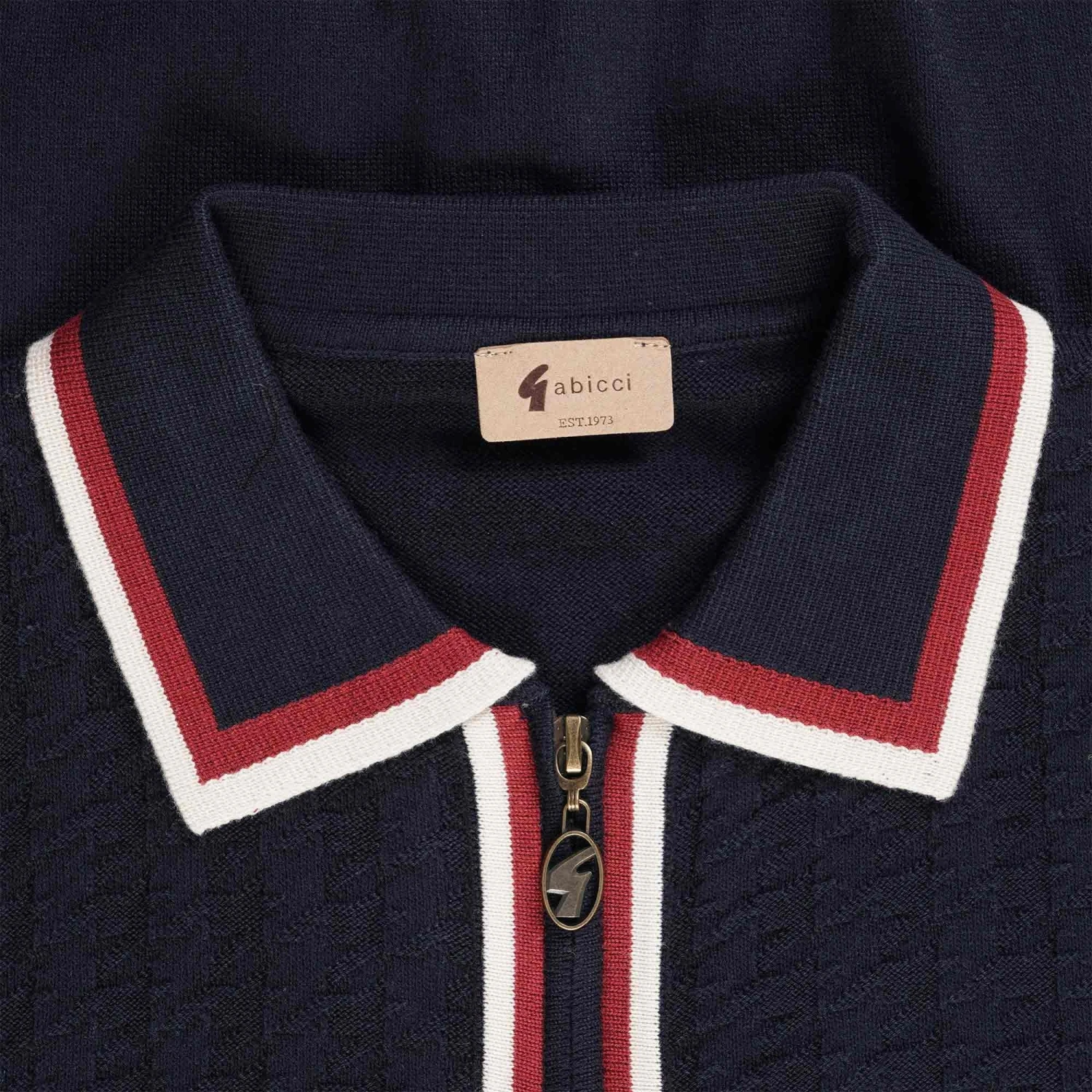 A long-sleeved, knitted cardigan-style shirt with a contrast rust hue on the collar and placket that has a tonal dogtooth design Has a branded zip pull and the trademark metal ‘G’ on the chest.