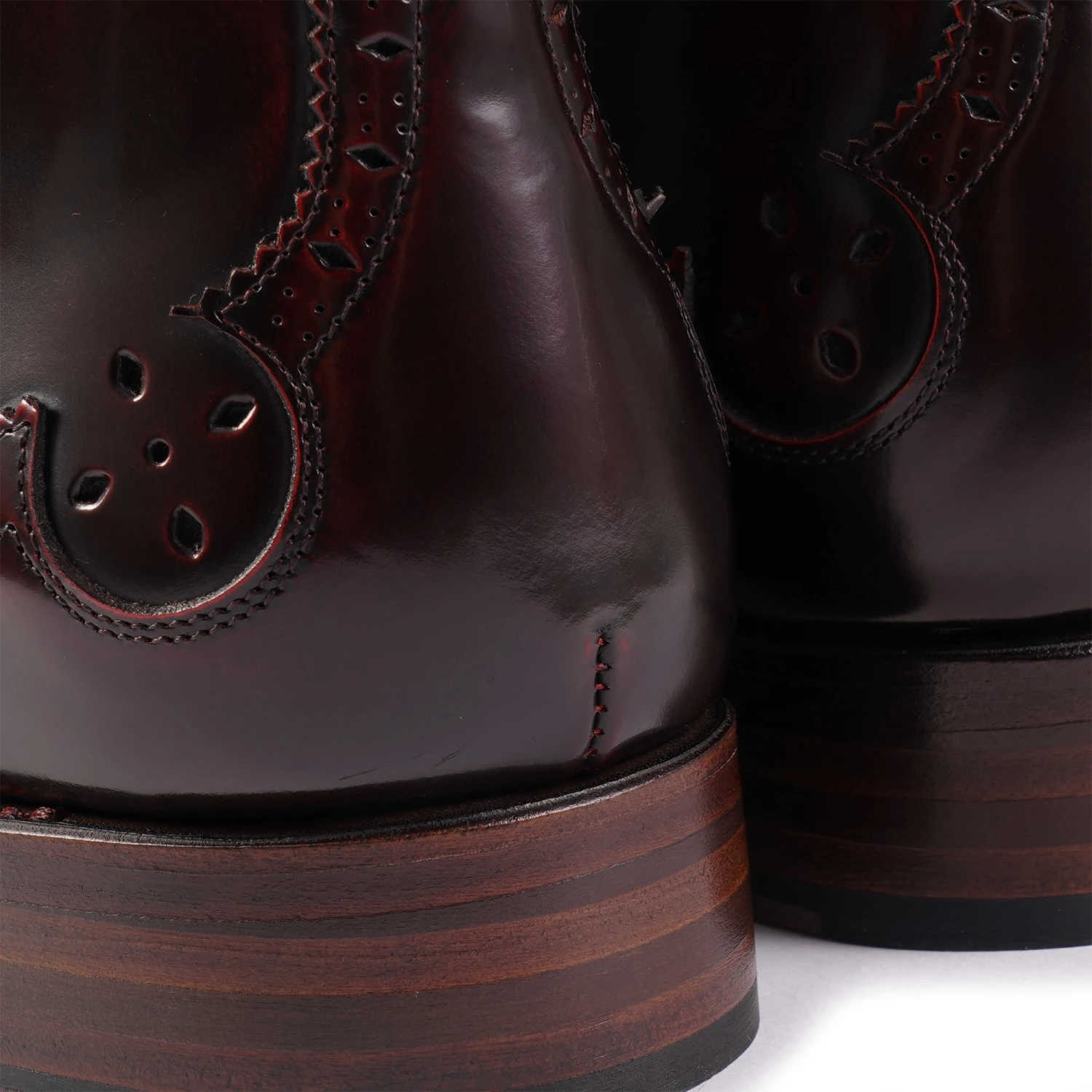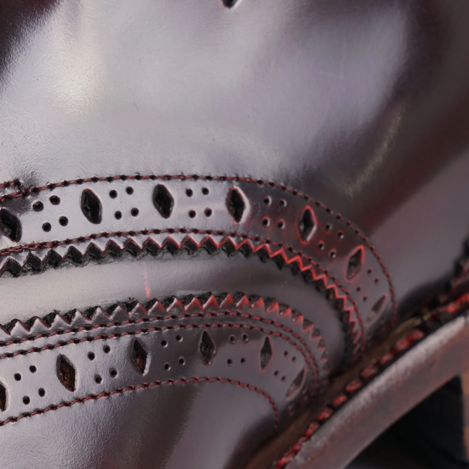 The ‘Falcata’ Wing tip Chukka boot on the Dexter last shape – in Vintage Red polish leather. Features a deathmoth toe punch, 5 and diamond brogue punching and ‘is Love the Drug’ sole design.