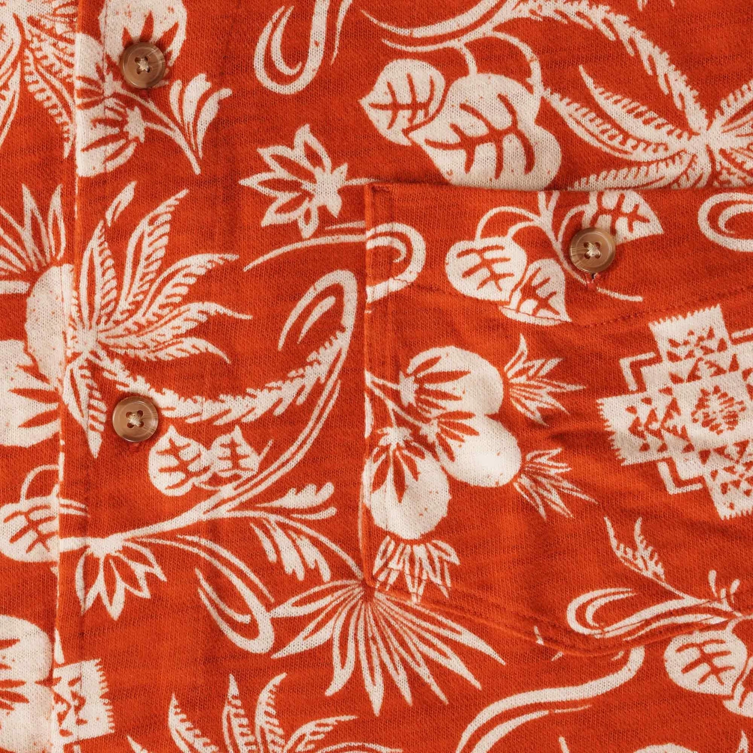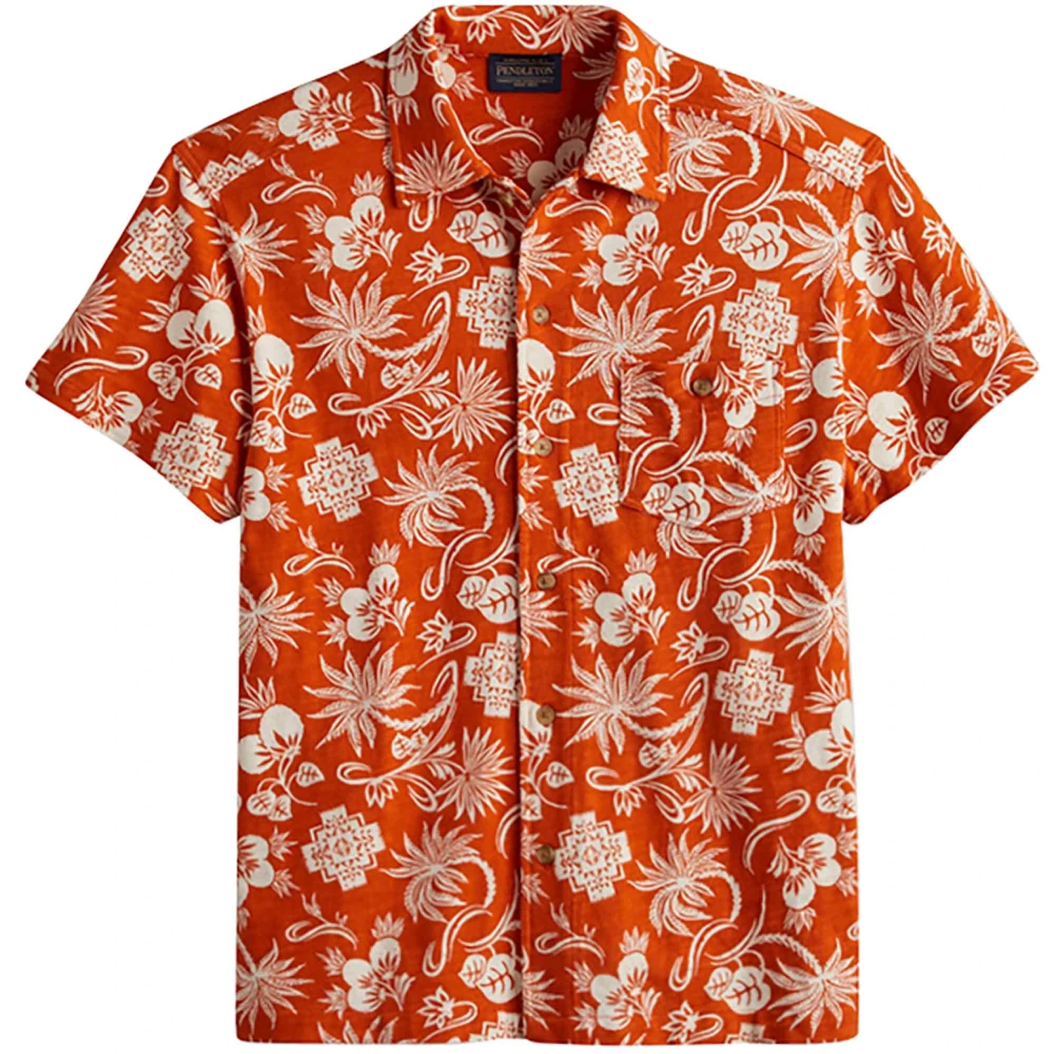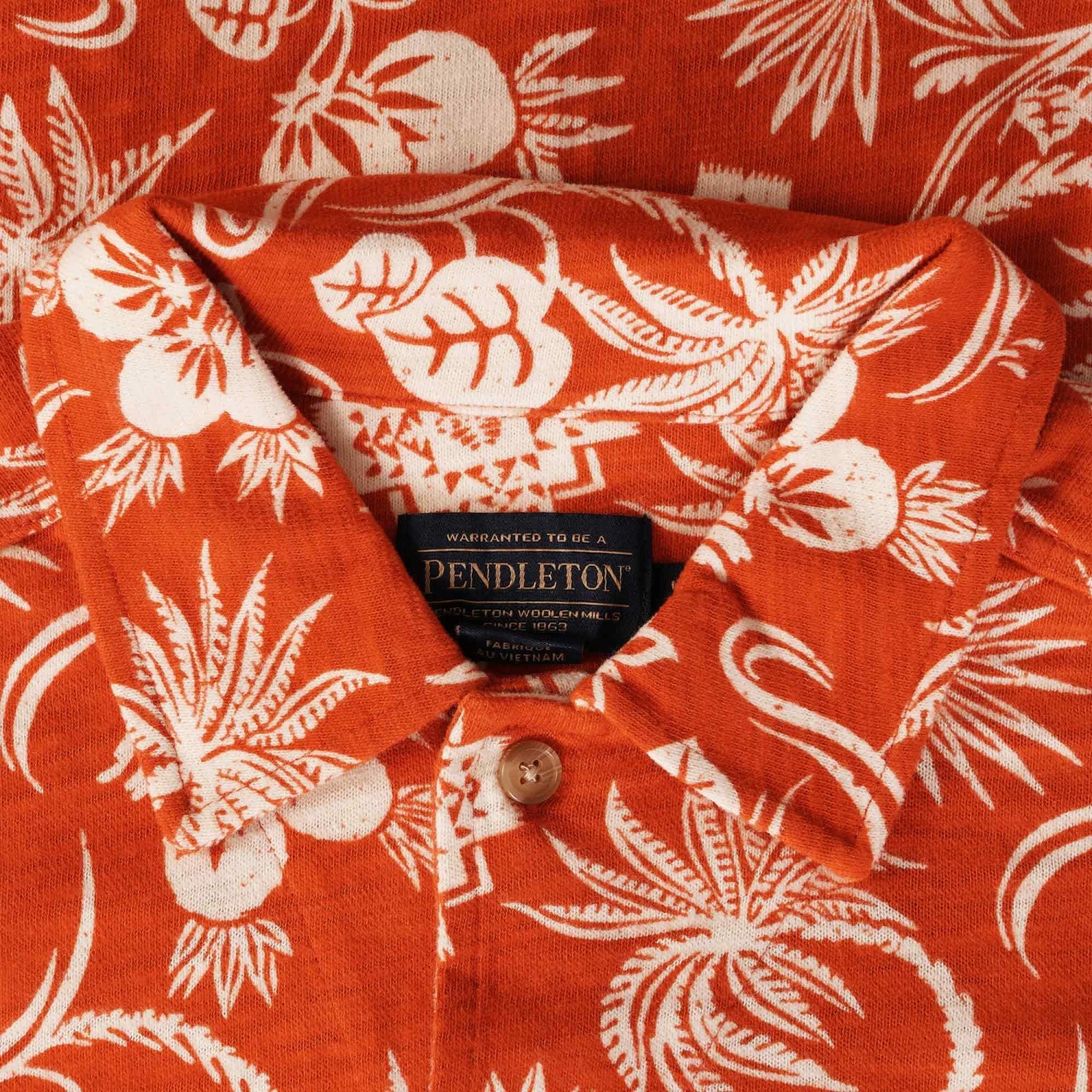 Warm-weather comfort in a soft, breathable cotton knit shirt featuring an exclusive Pendleton tropical print. One button-through chest pocket, high/low hem with side vents, back hanging loop.