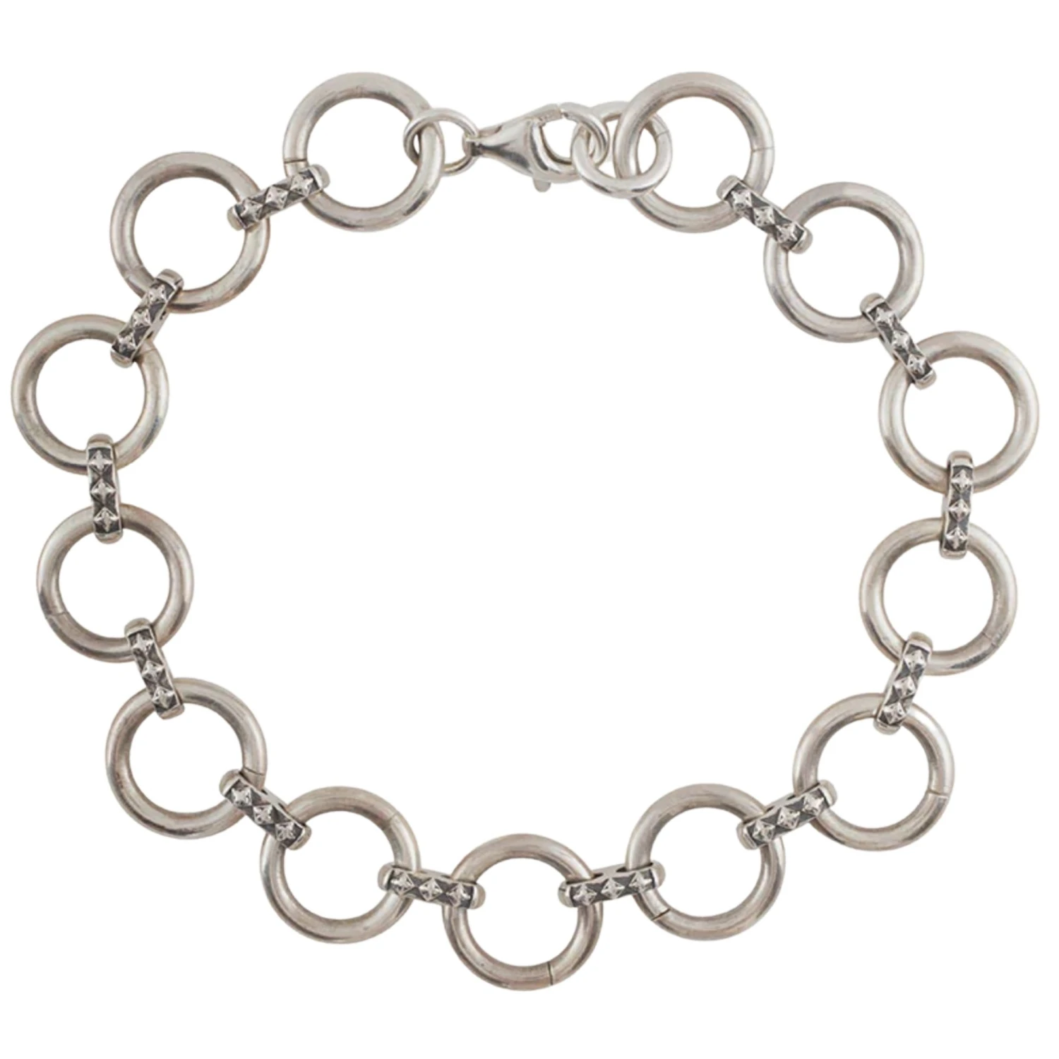 The silver wren link bracelet is built of a one-of-a-kind link structure with Tudor detailing between each link. The Goldsmiths Company Assay office certifies the quality of this piece, which is made of 925 Sterling Silver. This bracelet is made up of a series of strong silver rings, each connected to the next by a rectangle-shaped link.